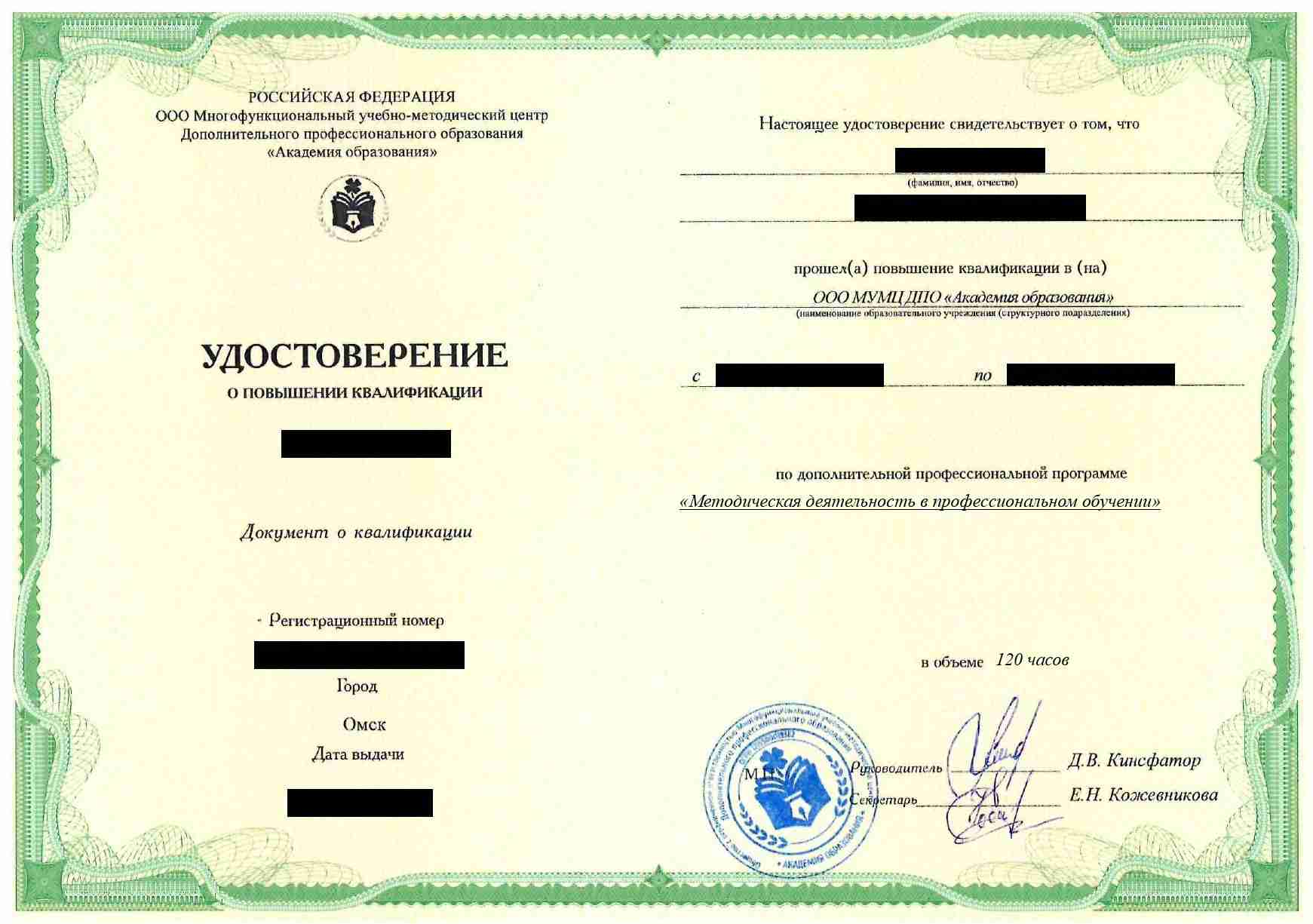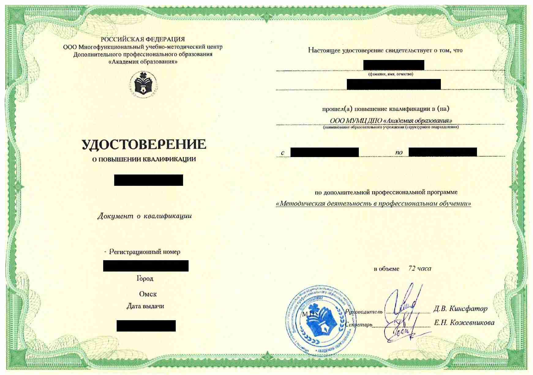 • Удостоверение о повышении квалификации установленного государством образца. Срок действия: 3 года